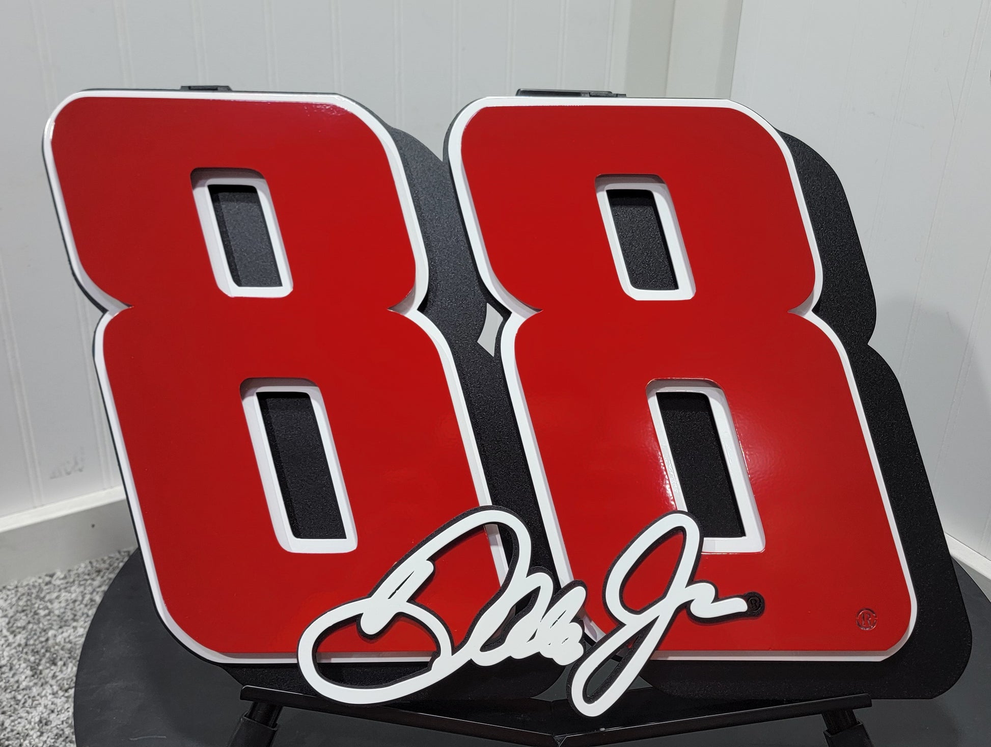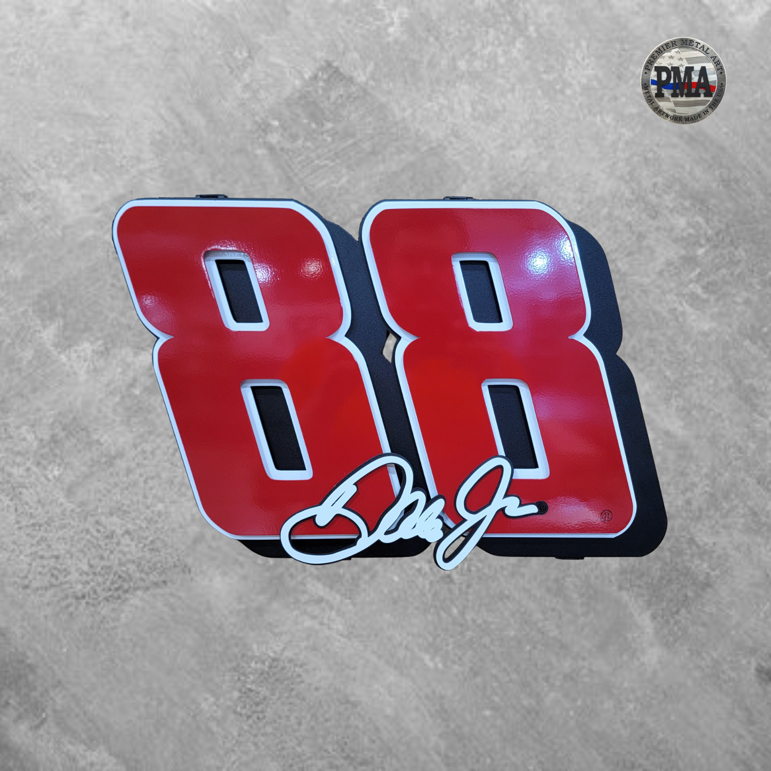 Celebrate your love for racing with these hand crafted pieces of multi-layer metal art. Perfect for the home or office. Take them to the track to get autographed for that one-of-a-kind personal piece of memorabilia. Made in America! Officially licensed with JR Motorsports!