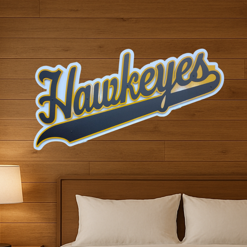 Are you an IOWA HAWKEYE fan, then this metal sign is for you! Proudly show your support with this Herky the Hawk metal sign. This multi-layered metal sign that is cut out of 10 gauge aluminum. We powder coat it to give it durability to hang indoor or out.